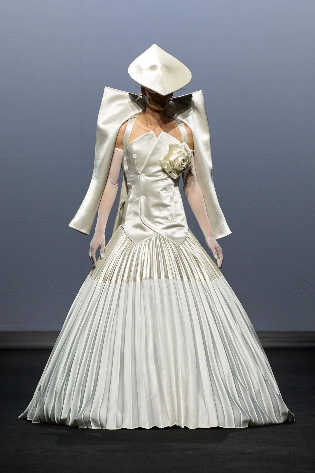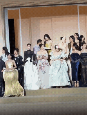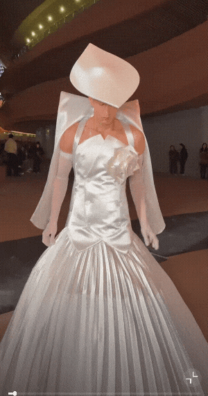 文琪的礼服乍一看没什么问题,但细看就会发现,这条水母裙为了追求飘逸的感觉,裙撑做得过于柔软,导致裙子总有一部分会被走位的裙撑弄得鼓鼓囊囊的。