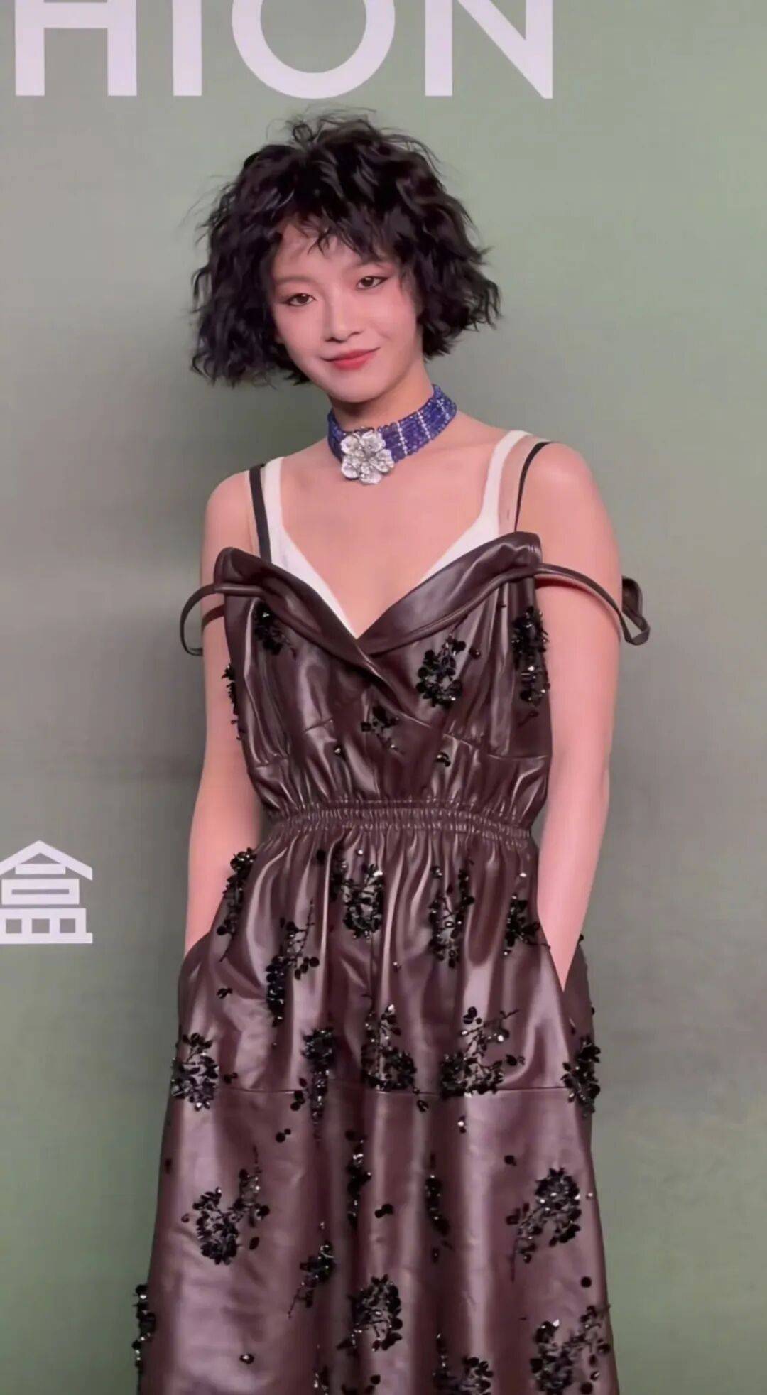 李庚希的造型给人一种割裂感,落肩小吊带皮裙很年轻、时尚,甚至还佩戴了有摇滚气质的项圈。