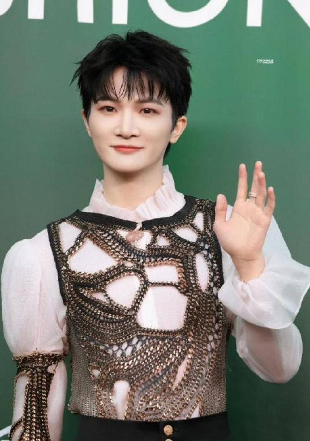 内搭是一件带蕾丝边的半透明薄纱衬衫,外面则是罩了一件金属质感的镂空罩衫。再加上厚厚的大浓妆,一眼看过去,雌雄难辨。